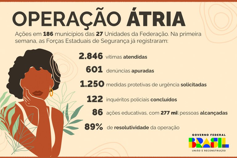 Nos primeiros sete dias de atuação em 2024, a Operação Átria atendeu 2.846 mulheres em ações de combate à violência de gênero. Cerca de 600 denúncias foram apuradas. A operação é coordenada pelo Ministério da Justiça e Segurança Pública e executada pelas Secretarias de Segurança Pública dos estados por meio das polícias Civil e Militar.