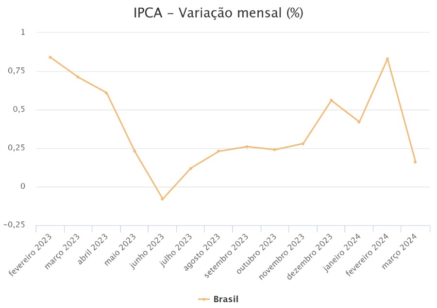A inflação do país desacelerou em março, registrando alta de 0,16% no mês, 0,67 ponto percentual (p.p) menor que em fevereiro, quando marcou 0,83%. No ano, a inflação acumulada está em 1,42%. Os dados são do Índice Nacional de Preços ao Consumidor Amplo (IPCA), divulgado nesta quarta-feira, 10 de abril, pelo Instituto Brasileiro de Geografia e Estatística (IBGE). Nos últimos 12 meses, os preços subiram 3,93%. Em março de 2023, o índice havia sido de 0,71%.