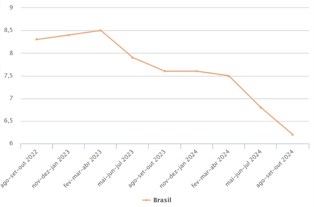 A taxa de desocupação no trimestre encerrado em outubro de 2024 recuou 0,6 ponto percentual (p.p.) frente ao trimestre de maio a julho de 2024 — queda de 6,8% para 6,2%. Frente ao mesmo trimestre móvel de 2023, o recuo foi ainda maior: 1,4 p.p.. Esta foi a menor taxa de desocupação da série histórica da PNAD Contínua, iniciada em janeiro / março de 2012. É também o menor número de pessoas desocupadas em uma década, desde o trimestre encerrado em dezembro de 2014. Os dados são da PNAD Contínua mensal, divulgados nesta sexta-feira, 29 de novembro, pelo IBGE.
