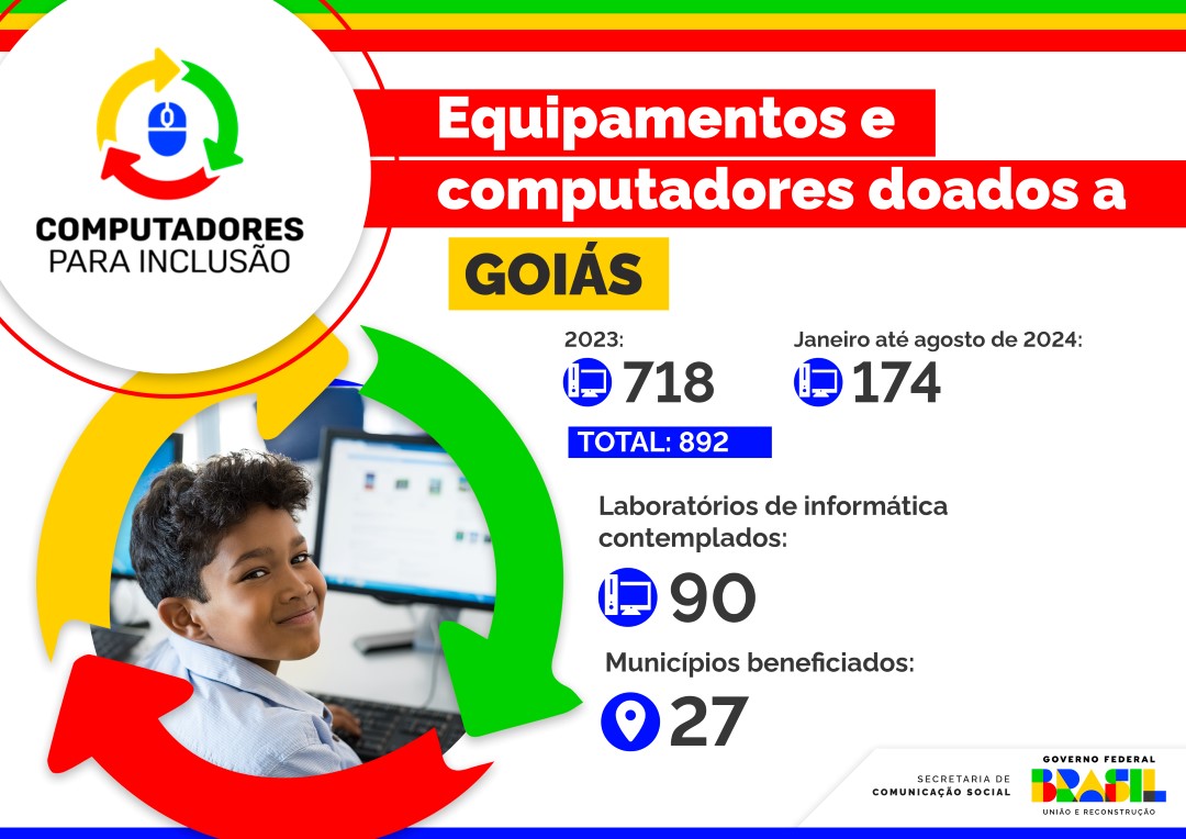 De janeiro de 2023 a agosto de 2024, foram doados 892 equipamentos e computadores recondicionados a alunos de Goiás. As doações ocorreram por meio do Computadores para Inclusão, programa do Governo Federal. Executada pelo Ministério das Comunicações (MCom), a iniciativa tem como objetivo apoiar e viabilizar ações de promoção da inclusão digital para jovens e adultos em situação de vulnerabilidade social. Em 2023, Goiás recebeu 718 doações e, até agosto de 2024, foram 174.