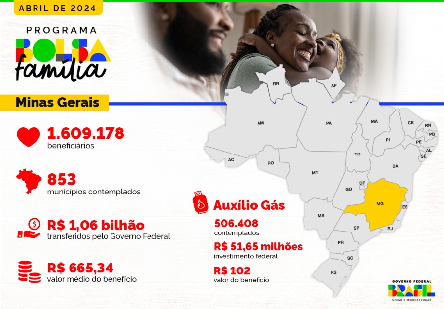 A partir desta quarta-feira, 17 de abril, mais de 1,6 milhão de beneficiários de Minas Gerais recebem o repasse do Bolsa Família. Trata-se da quarta Unidade da Federação com maior número de contemplados neste mês pelo programa, que chega aos 853 municípios mineiros a partir de um repasse de R$ 1 bilhão. O valor médio do benefício no estado chega a R$ 665,34. O cronograma de pagamento leva em conta o final do Número de Identificação Social (NIS) de cada um dos beneficiários (veja abaixo) e segue até o dia 30.