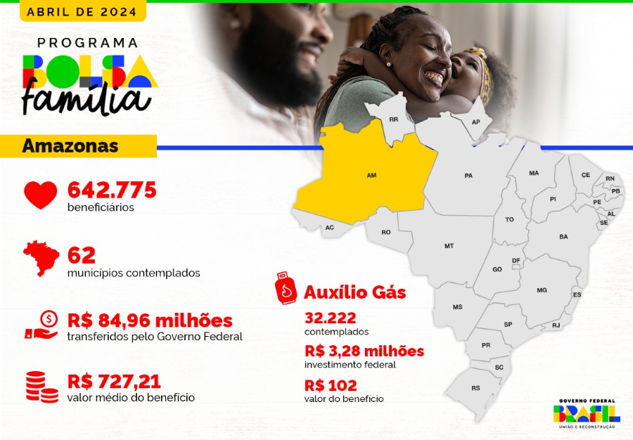 A partir desta quarta-feira (17/4), mais de 642 mil beneficiários do Amazonas recebem o repasse do Bolsa Família. O programa de transferência de renda do Governo Federal chega aos 62 municípios do estado a partir de um repasse de R$ 475 milhões. O valor médio do benefício para os amazonenses chega a R$ 740,62. O cronograma de pagamento leva em conta o final do Número de Identificação Social (NIS) de cada um dos beneficiários (veja abaixo) e segue até o dia 30.
