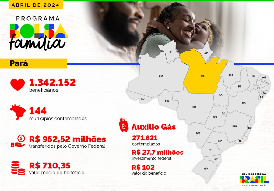 A partir desta quarta-feira (17/4), mais de 1,3 milhão de beneficiários do Pará recebem o repasse do Bolsa Família. O programa de transferência de renda do Governo Federal chega aos 144 municípios do estado a partir de um repasse de R$ 952,5 milhões. O valor médio do benefício para os paraenses chega a R$ 710,35. O cronograma de pagamento leva em conta o final do Número de Identificação Social (NIS) de cada um dos beneficiários (veja abaixo) e segue até o dia 30.