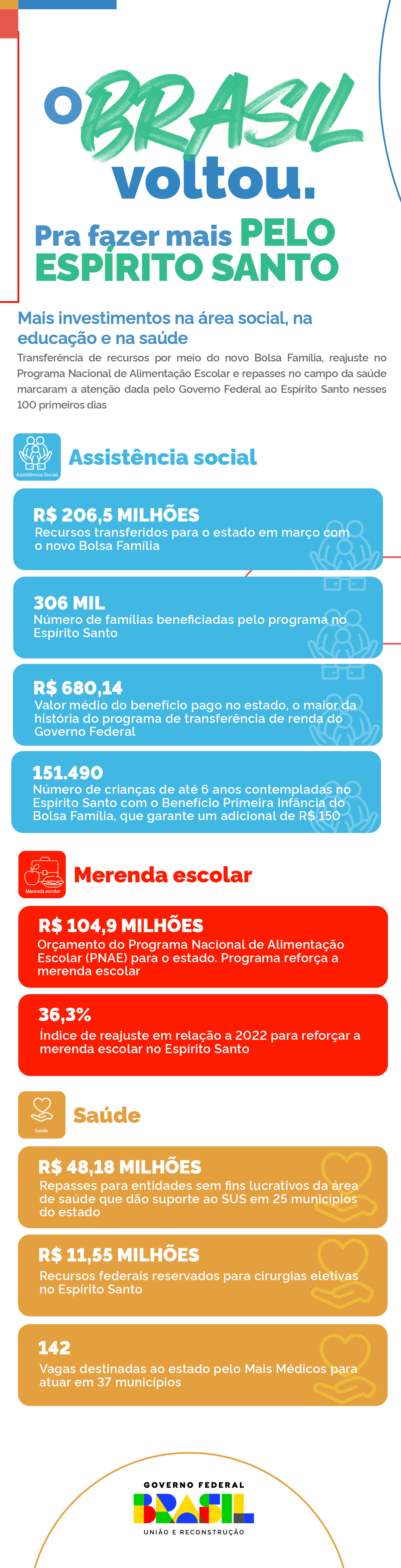 Algumas das principais ações federais destinadas ao Espírito Santo nos 100 primeiros dias do terceiro mandato do presidente Luiz Inácio Lula da Silva foram realizadas na área social, especialmente no combate à pobreza, com mais de 300 mil famílias assistidas com o retorno do Bolsa Família, que teve no estado o maior valor médio de benefício de toda a Região Sudeste. Investimentos na área da saúde e um reajuste de mais de 36% nos repasses do Programa Nacional de Alimentação Escolar (PNAE) foram outros destaques na atenção por parte do Governo Federal ao estado.