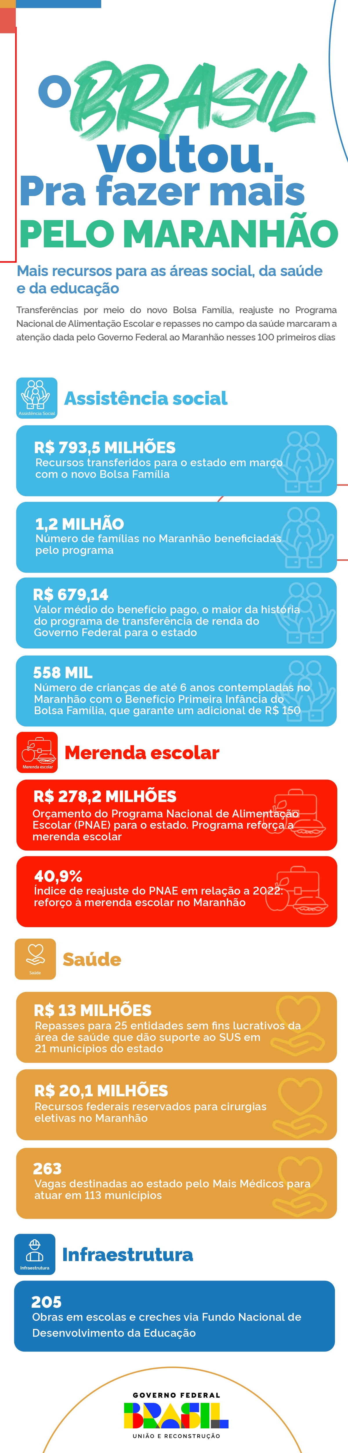 Nesses 100 primeiros dias do terceiro mandato do presidente Luiz Inácio Lula da Silva, o Maranhão teve o maior benefício médio de todo o Nordeste na retomada do Bolsa Família e recebeu o terceiro maior repasse da região por parte do Programa Nacional de Alimentação Escolar, que passou por reajuste de 40,9% no estado.