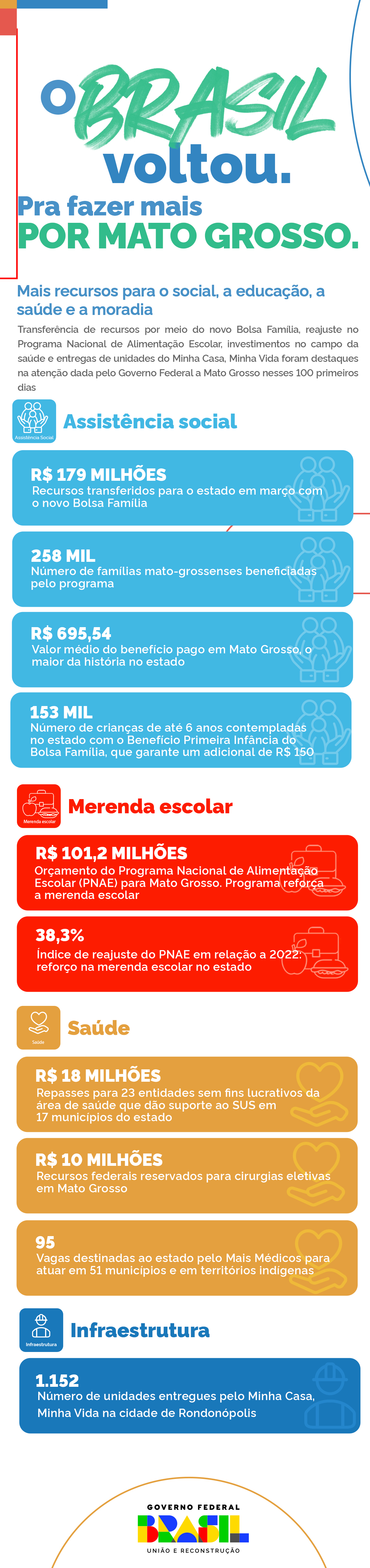 Para o estado de Mato Grosso, os investimentos federais realizados nos 100 primeiros dias do terceiro mandato do presidente Luiz Inácio Lula da Silva tiveram impacto no âmbito social. O estado teve o maior valor médio de benefício do Bolsa Família no Centro-Oeste e 258 mil famílias foram assistidas em março, mês que marcou a retomada do programa.