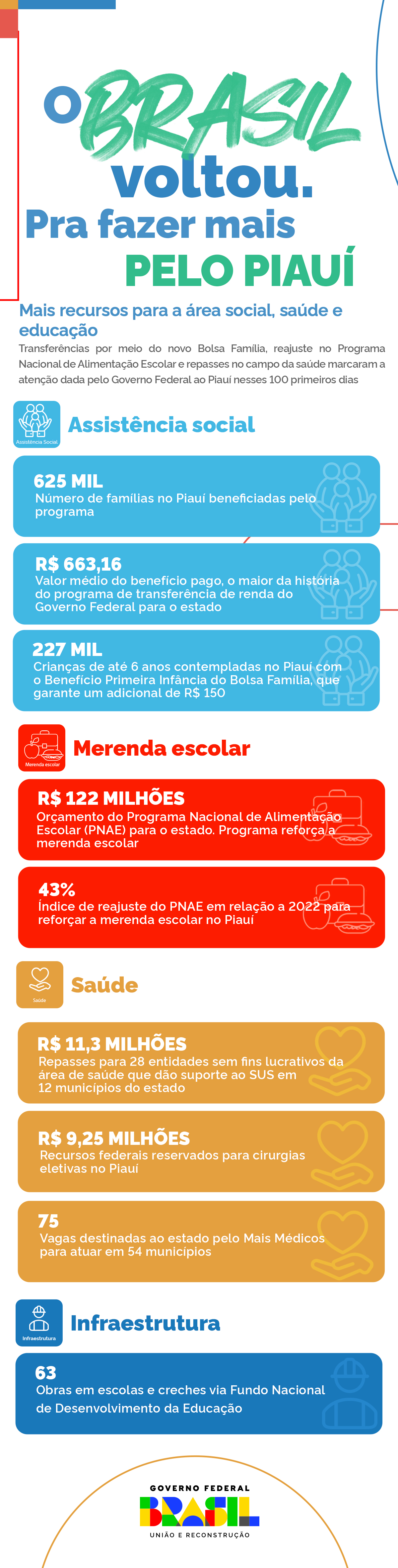 Repasses voltados ao enfrentamento da pobreza, à melhoria da qualidade da merenda escolar e à garantia de um atendimento mais eficiente em diversas instituições de saúde foram destaque no Piauí entre as ações do Governo Federal nesses 100 primeiros dias do terceiro mandato do presidente Luiz Inácio Lula da Silva.