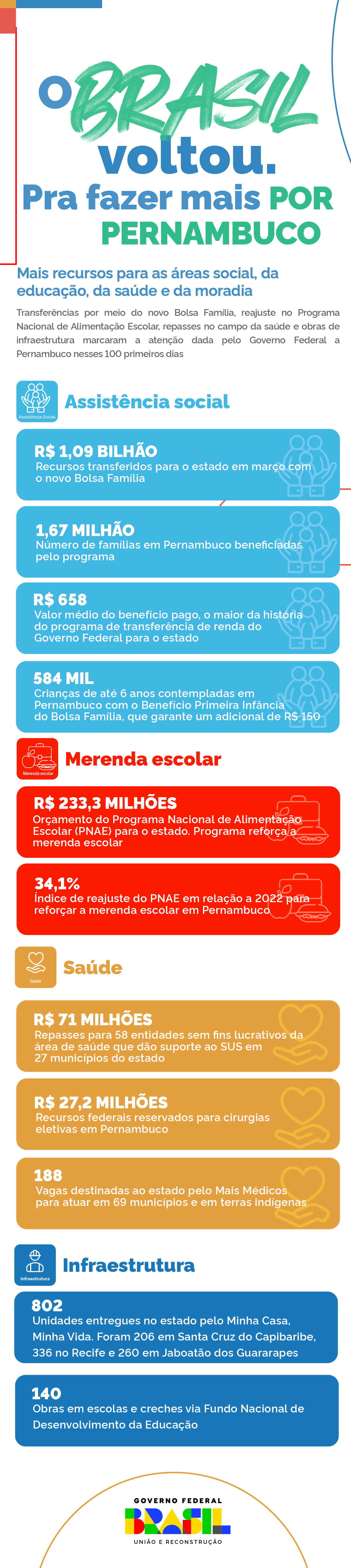O estado de Pernambuco recebeu nesses 100 dias de gestão do terceiro mandato do presidente Luiz Inácio Lula da Silva diversos investimentos no campo social, com destaque para o Bolsa Família, a garantia de recursos para a melhoria da qualidade da merenda escolar, a entrega de unidades habitacionais do Minha Casa, Minha Vida e a transferência de recursos para melhorias no campo da saúde.