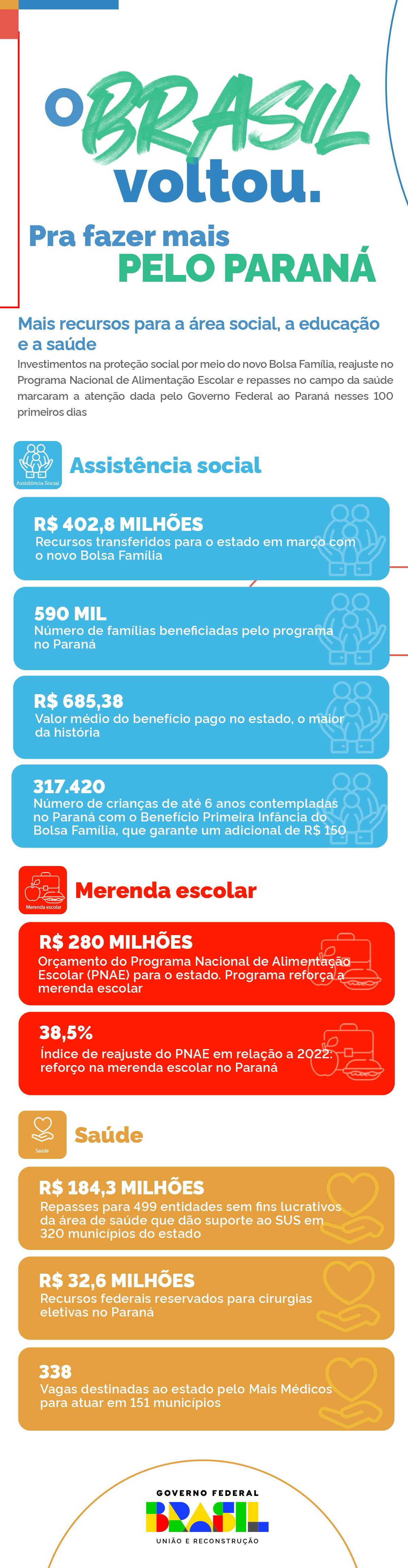 Nos primeiros 100 dias de gestão, o governo do presidente Luiz Inácio Lula da Silva anunciou a recriação de políticas públicas consideradas essenciais para inclusão social, combate à fome e igualdade de oportunidades. As medidas chegaram a todos as Unidades da Federação. O Paraná recebeu R$ 400 milhões para pagamento do novo Bolsa Família e R$ 280 milhões após reajuste de 38,5% no programa voltado para a garantia de merenda escolar nas escolas.