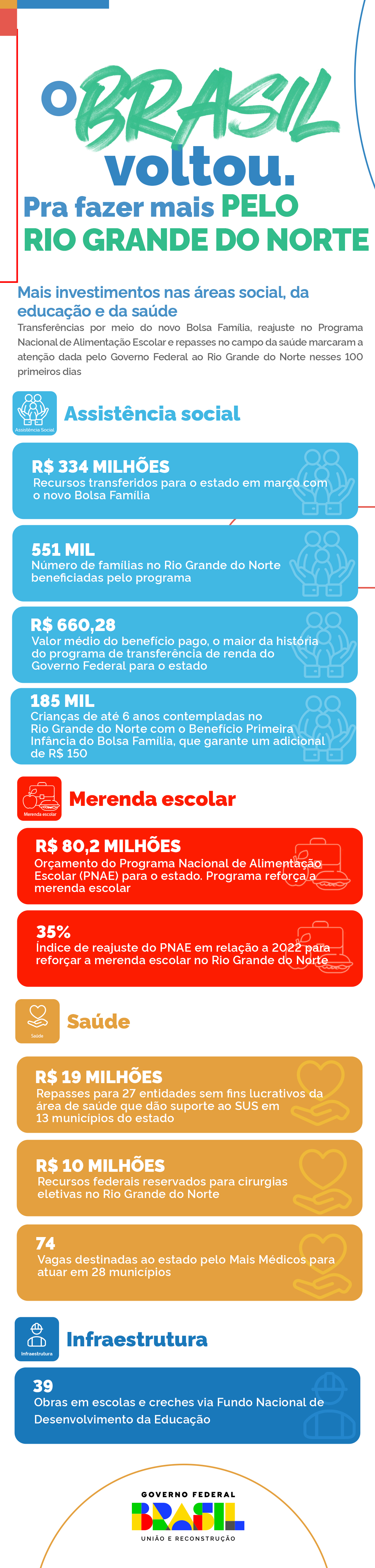Investimentos sociais voltados à redução da pobreza e na área da saúde, melhoria da qualidade da merenda servidas nas escolas e um intenso suporte a uma crise de segurança pública marcaram as ações do Governo Federal para o Rio Grande do Norte nesses 100 primeiros dias do terceiro mandato do presidente Luiz Inácio Lula da Silva.