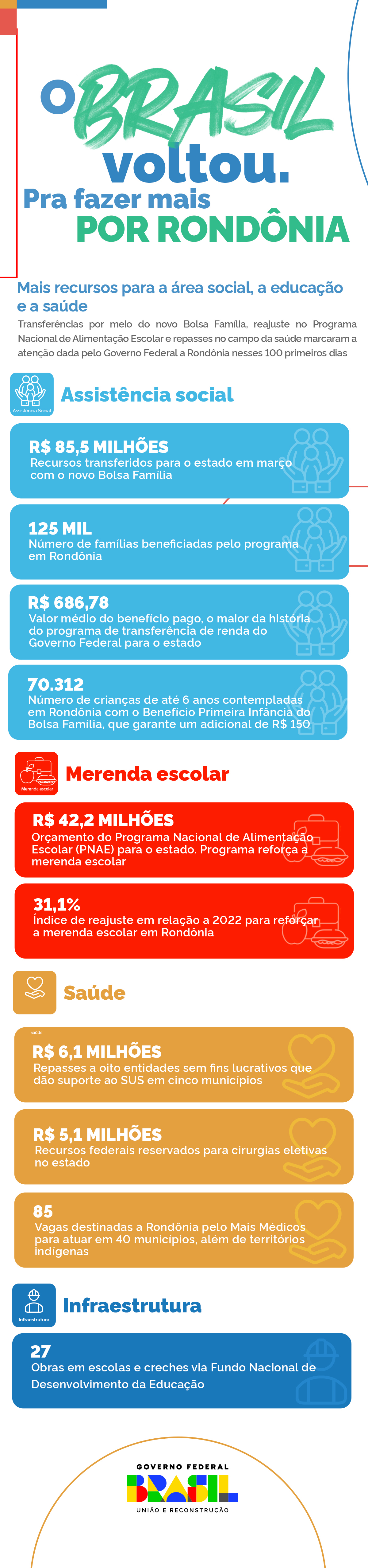 Investimentos na área social destinados ao enfrentamento da pobreza, melhoria da qualidade das merendas escolares e garantia de investimentos na saúde marcaram o suporte do Governo Federal a Rondônia nesses 100 primeiros dias do terceiro mandato do presidente Luiz Inácio Lula da Silva.