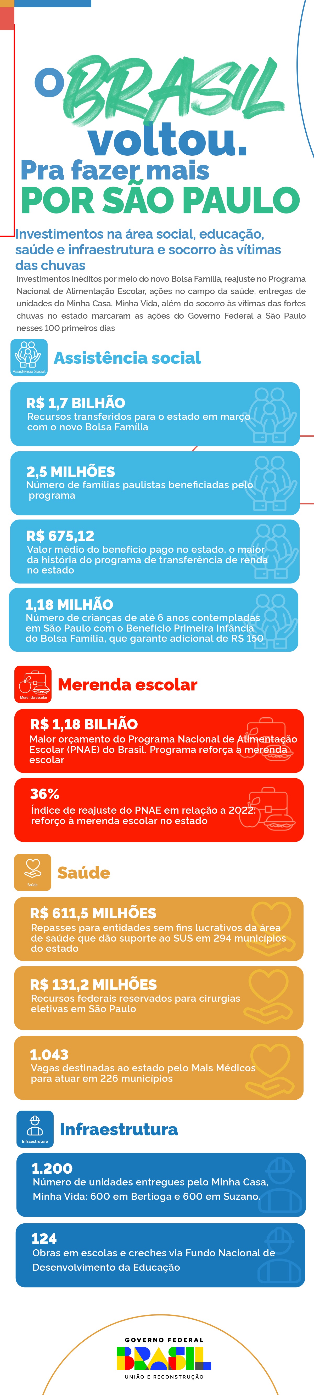 O BRASIL VOLTOU - No plano nacional, os primeiros cem dias foram marcados pela retomada de programas essenciais para que o país se coloque na condição de combater a fome e a miséria e de gerar oportunidades de emprego, renda e cidadania. O Bolsa Família, em março, chegou a 21,1 milhões de famílias contempladas, com repasse médio recorde de R$ 670,33 e o investimento inédito de R$ 14 bilhões.