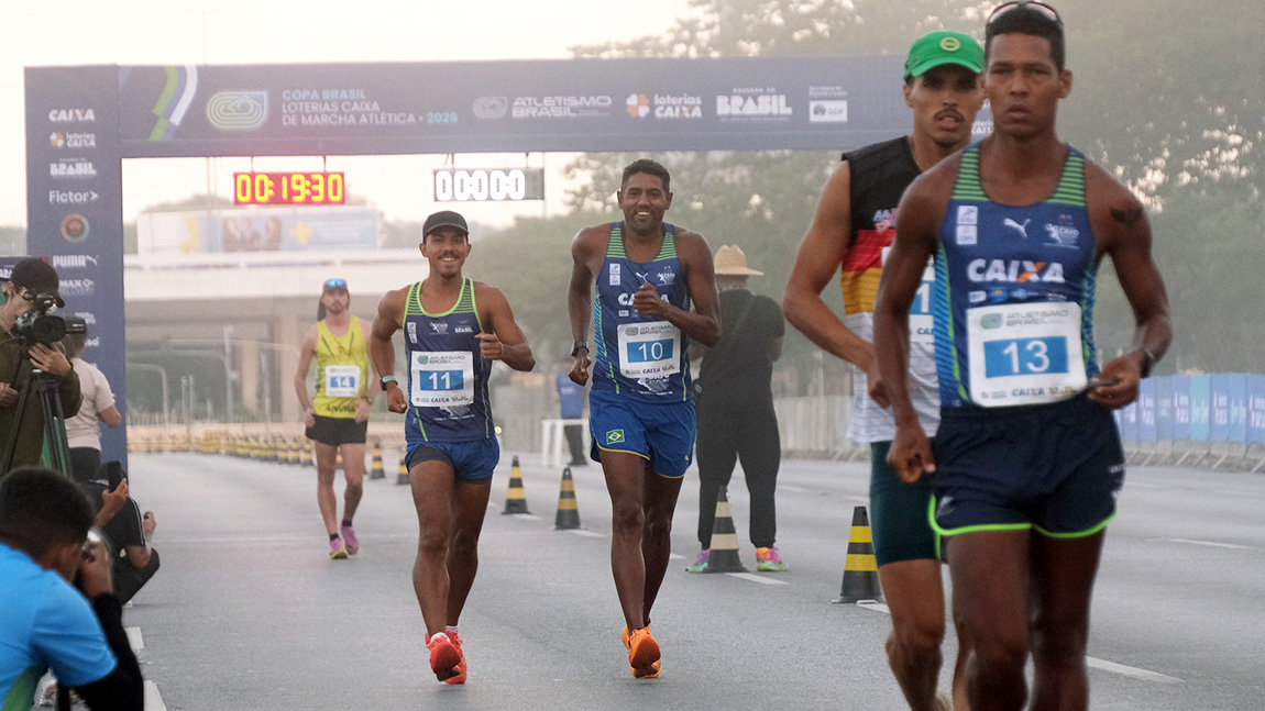 Grupo de atletas em marcha atlética durante a Copa Brasil 2026, sorrindo e fazendo gestos positivos enquanto cruzam o percurso. Um cronômetro digital exibe o tempo de 19 minutos e 30 segundos. Ao fundo, há sinalização do evento, fotógrafos e espectadores.