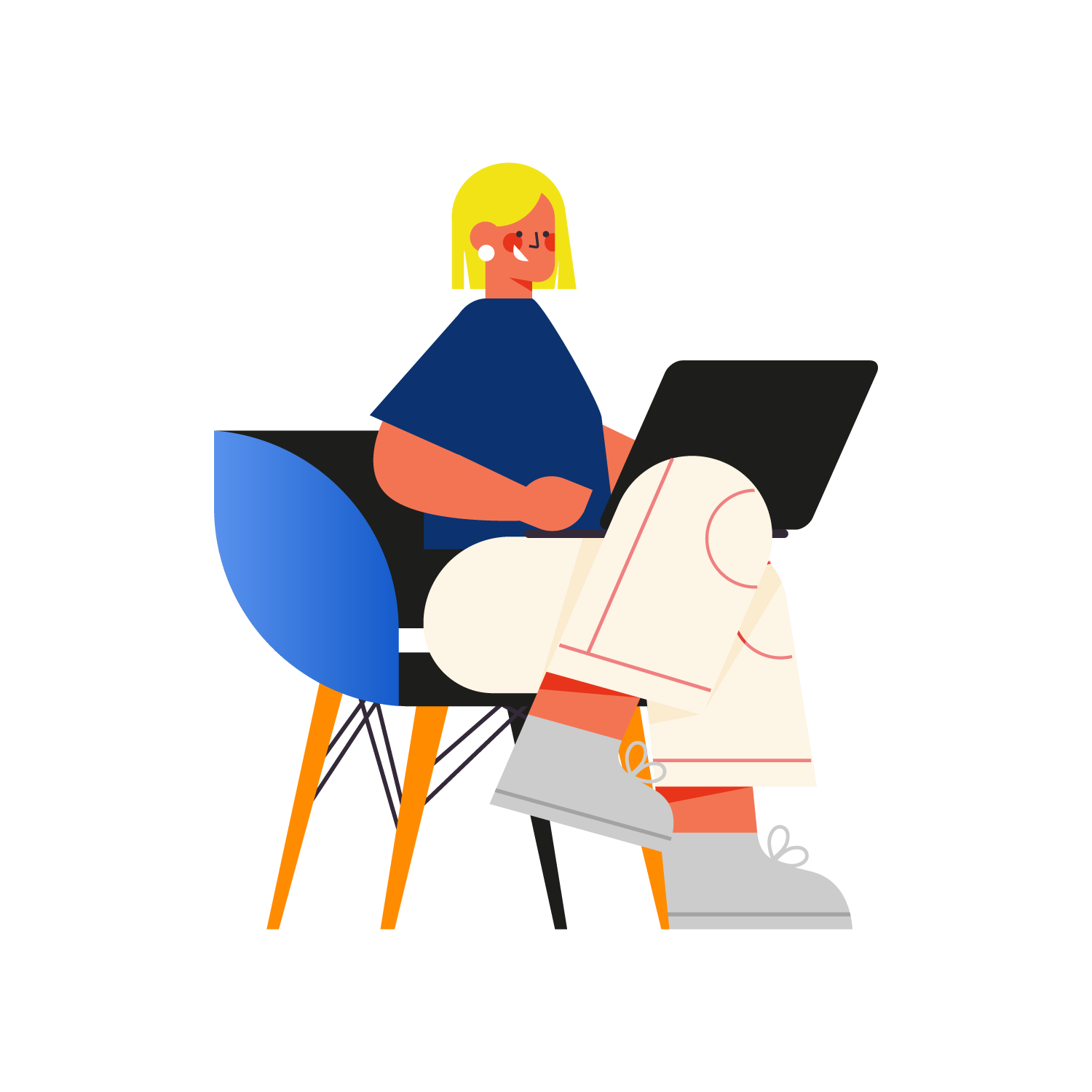 Ilustração de uma mulher de cabelos loiros sentada em uma cadeira azul com um laptop no colo.