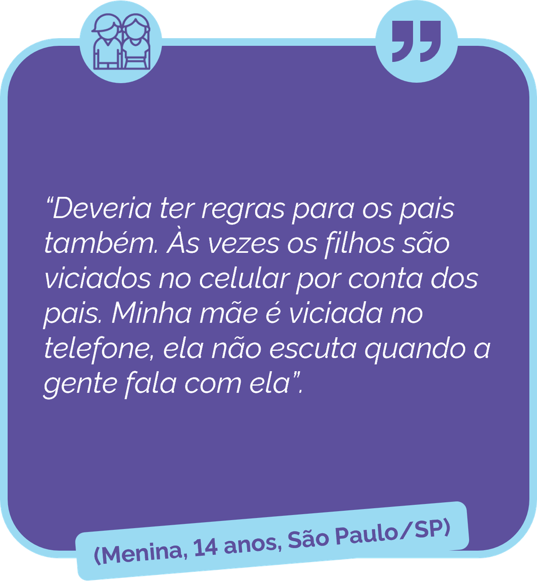 Crianças apresentaram consciência sobre possíveis perigos da internet e das telas, por isso concordaram com um monitoramento mais próximo, referindo se sentirem mais seguras assim. Já os adolescentes, à medida que crescem, afirmam necessitar cada vez mais de espaço e privacidade, por isso podem se sentir invadidos dependendo da regra, mas também porque se consideram capazes de fazer a gestão do próprio uso.