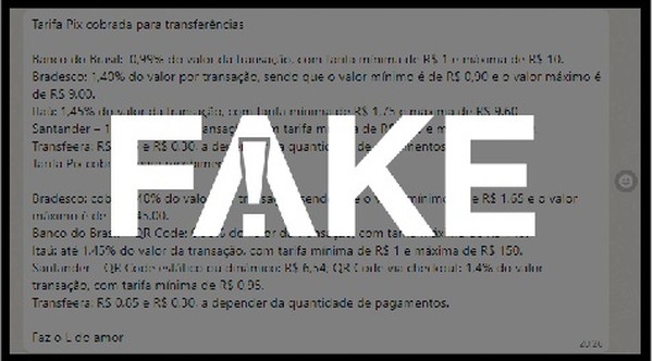 De acordo com apuração do sistema de checagem do G1, Fato ou Fake, é falsa a mensagem que circula nas redes sociais que descreve tarifas cobradas por bancos em transferências de PIX sem mencionar que as regras expostas se referem a pessoas jurídicas -- e não físicas. A mensagem termina com a expressão "faz o L" e sugere que a medida entrou em vigor após a posse do presidente Luiz Inácio Lula da Silva. Esta informação é FALSA.