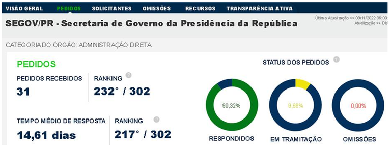 No período de 1º de janeiro a 31 de outubro de 2022, o Serviço de Informação ao Cidadão da Secretaria de Governo da Presidência da República (SIC-SeGov) recebeu um total de 31 pedidos de acesso à informação (LAI), ocupando a 232ª posição entre os órgãos mais demandados e 05 recursos. Desse total, 60% foram submetidos à primeira instância recursal; 20% à segunda instância (cuja autoridade responsável é o Ministro de Estado Chefe da Secretaria de Governo); 20% dos recursos chegaram à Controladoria-Geral da União (terceira instância recursal) e 0% à Comissão Mista de Reavaliações de Informações – CMRI (quarta instância recursal).