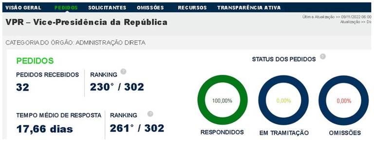 No período de 1º de janeiro a 31 de outubro de 2022, o Serviço de Informação ao Cidadão da Vice-Presidência da República (SIC-VPR) recebeu um total de 32 pedidos de acesso à informação (LAI) ocupando a 230ª posição entre os órgãos mais demandados e 08 recursos. Desse total, 50% foram submetidos à primeira instância recursal; 25%, à segunda instância (cuja autoridade responsável é o Chefe de Gabinete da Vice-Presidência); 25% dos recursos chegaram à Controladoria-Geral da União (terceira instância recursal) e 0% à Comissão Mista de Reavaliações de Informações – CMRI (quarta instância recursal).