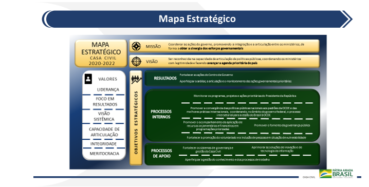 O Mapa Estratégico anuncia, de modo simples e fácil, a visão de futuro, a missão institucional, os valores da pasta e os objetivos estratégicos que norteiam a atuação da Casa Civil como órgão vital para Centro de Governo. A Cadeia de Valor é representada pelos macroprocessos organizacionais que geram valores públicos para a sociedade.