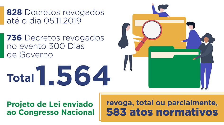 O Presidente Jair Bolsonaro revogou 736 decretos considerados não eficazes ou de validade prejudicada por meio da assinatura de três decretos durante evento em celebração aos 300 dias de governo , realizado na terça-feira, 5, no Palácio do Planalto. Com a assinatura das normativas, o Governo Federal já contabiliza a revogação de 1.564 atos em 2019, simplificando a pesquisa de acesso à legislação pelo cidadão.