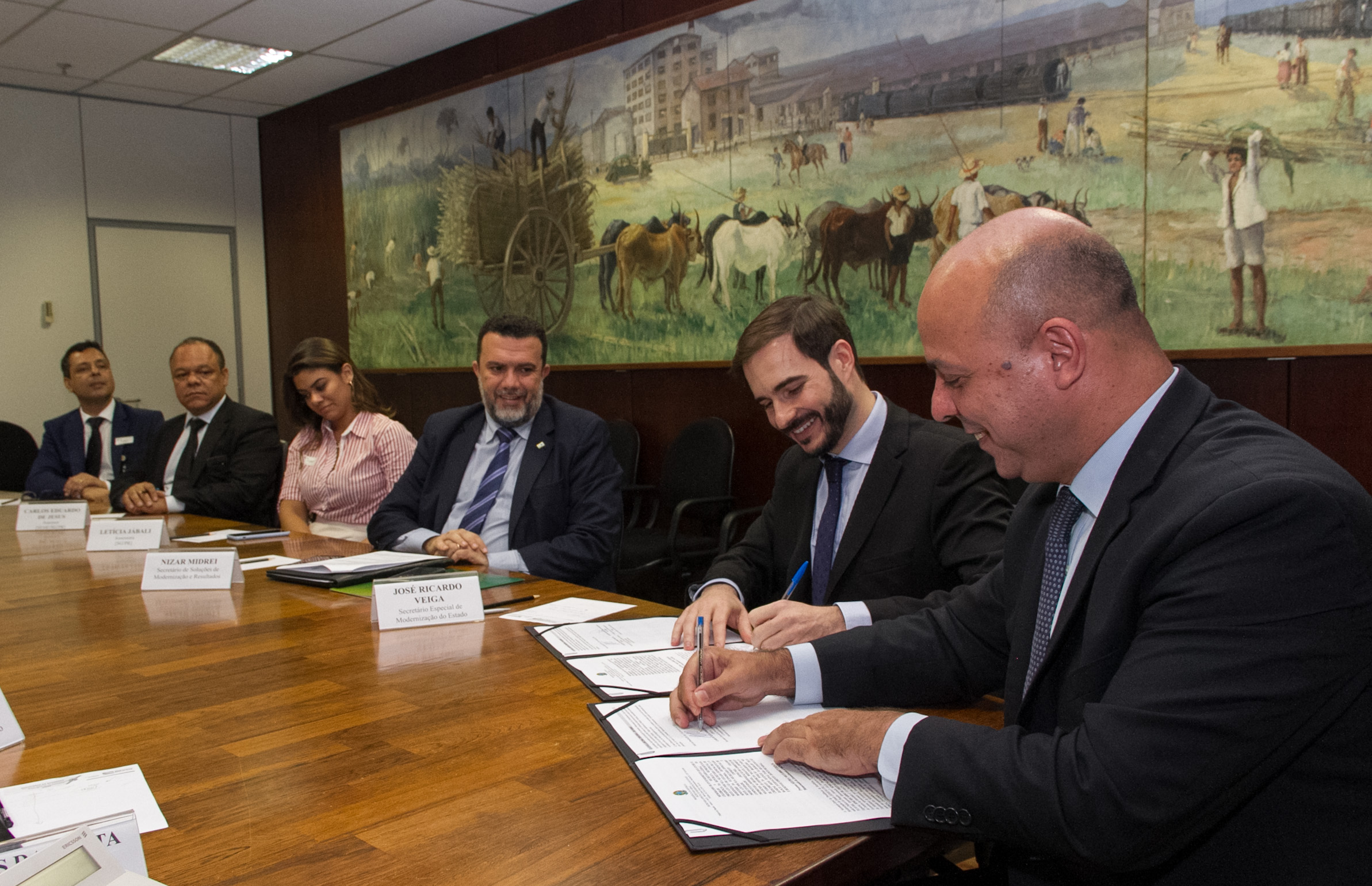 O Secretário Especial de Modernização do Estado da Secretaria-Geral da Presidência da República, José Ricardo Martins da Veiga, e o Secretário Especial de Emprego, Produtividade e Competitividade do Ministério da Economia, Carlos da Costa, assinaram, na tarde desta segunda-feira (17), o segundo Memorando de Entendimento entre a Secretaria-Geral da Presidência e o Ministério da Economia para promover a modernização de indicadores para a melhoria do ambiente de negócios no Brasil.