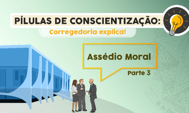 Finalizando a divulgação do primeiro tema do projeto Pílulas de Conscientização: Corregedoria explica! , a Secretaria de Controle Interno da Secretaria-Geral da Presidência da República – CISET/SG/PR lança a terceira e última parte do vídeo sobre Assédio Moral.