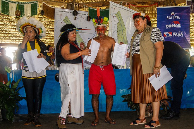 A secretária-executiva da Secretaria-Geral da Presidência, Maria Fernanda Coelho, a ministra dos Povos Indígenas, Sonia Guajajara, a presidenta da Funai, Joenia Wapichana, e a secretária estadual dos Povos Indígenas, Puyr Tembé, entregaram o documento a lideranças das aldeias. Todos demonstraram alegria, agradecimento e reconhecimento dos esforços do governo com a cultura, o meio ambiente e os direitos indígenas.