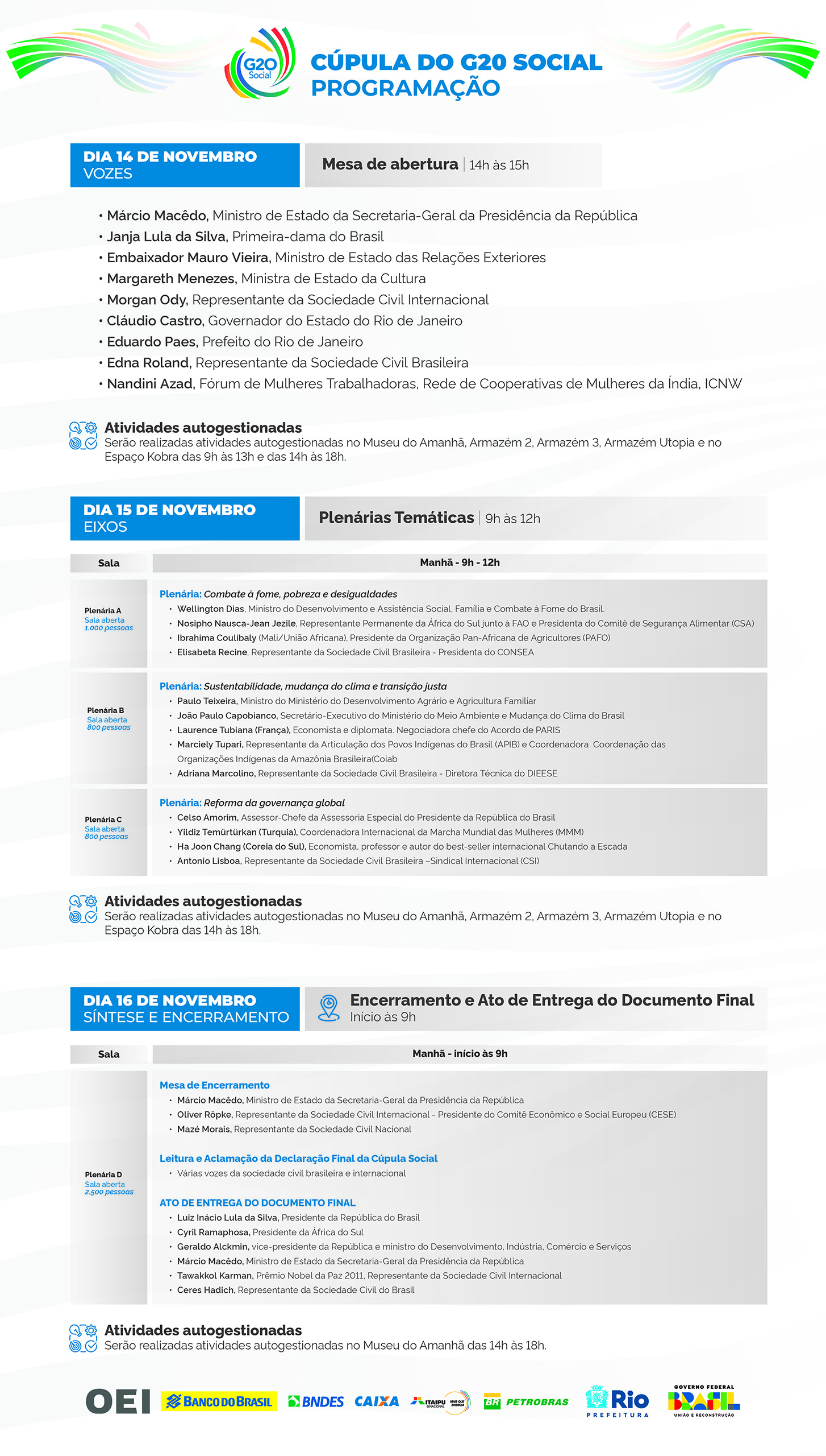 No dia 14 de novembro, a partir das 14h, haverá a cerimônia de abertura com a presença do ministro Márcio Macêdo, da Secretaria-Geral da Presidência da República, da Primeira-Dama Janja da Silva, do governador do RIo de Janeiro, Cláudio Castro, do prefeito da cidade do Rio de Janeiro, Eduardo Paes, do embaixador Mauro Vieira, ministro das Relações Exteriores, de Fernando Haddad, ministro da Fazenda, de Margareth Menezes, ministra da Cultura, de Morgan Ody, representante da Sociedade Civil Internacional e de Edna Roland, representante da Sociedade Civil Brasileira.