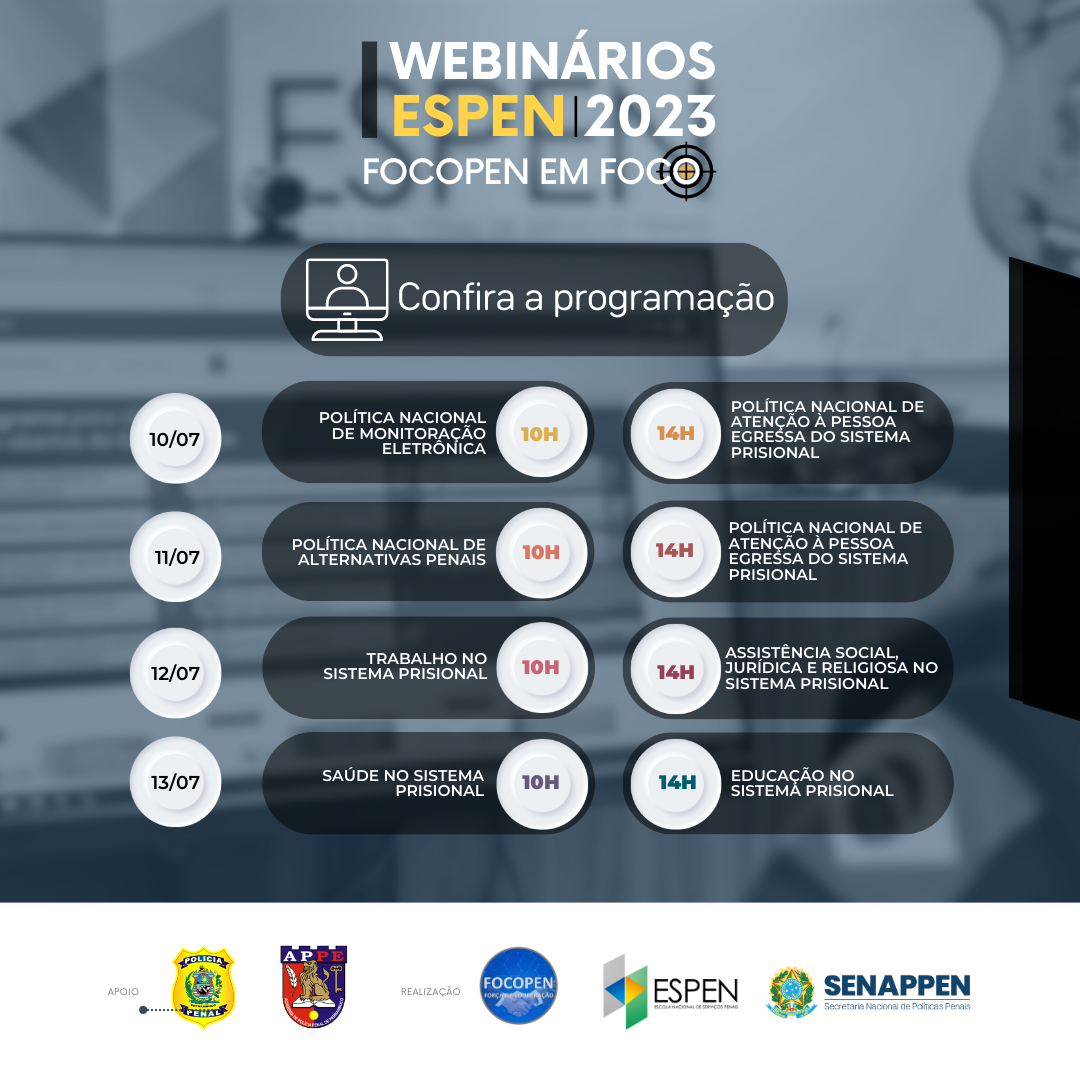 Brasília, 11/07/2023 - A Secretaria Nacional de Políticas Penais (SENAPPEN), por meio da Escola Nacional de Serviços Penais (ESPEN), em conjunto com a Secretaria de Justiça e Direitos Humanos do estado de Pernambuco (SJDHPE), entre os dias 10 e 13 deste mês, realizam uma Série de Webinários temáticos com objetivo de apresentar as Diretorias, respectivas políticas de desenvolvidas, indicadores estaduais, boas práticas evidenciadas aos servidores mobilizados no âmbito da Força de Cooperação Penitenciária (Focopen) e policiais penais do estado de Pernambuco.