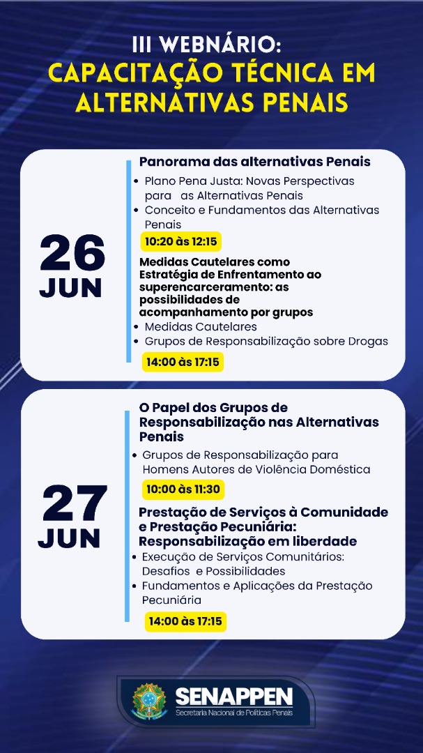 Brasília/DF, 25/06/2025 - A Secretaria Nacional de Políticas Penais (SENAPPEN), por meio da Diretoria de Cidadania e Alternativas Penais (DICAP), realizará o III Webinário: Capacitação Técnica em Alternativas Penais. O evento ocorrerá nos dias 26 e 27 de junho, em formato virtual, e vai reunir representantes estaduais que atuam na Política de Alternativas Penais, nas Centrais Integradas de Alternativas Penais (CIAPs) e no Serviço de Atendimento à Pessoa Custodiada (APECs).
