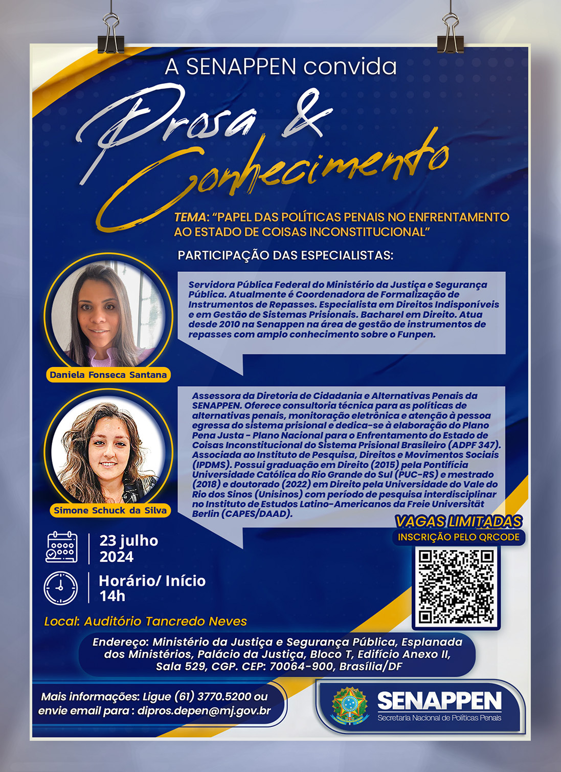 Brasília, 12/07/2024 – A Secretaria Nacional de Políticas Penais (SENAPPEN), por meio da Diretoria de Cidadania e Alternativas Penais (DICAP) e da Diretoria de Políticas Penitenciárias (DIRPP), promoverá a primeira edição do projeto Prosa & Conhecimento 2024 que , no Auditório Tancredo Neves do Palácio da Justiça, em Brasília/DF.