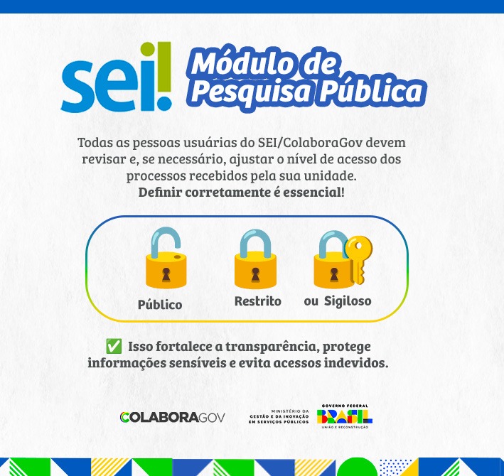Você sabia? Todo usuário do SEI/ColaboraGov deve revisar o nível de acesso atribuído aos processos recebidos em sua unidade, ajustando-o sempre que necessário (Art. 9º da Instrução Normativa DAL/ME nº 23, de 9 de maio de 2022).