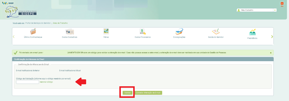 3.9.Será enviado um código de validação para o e-mail a ser alterado: