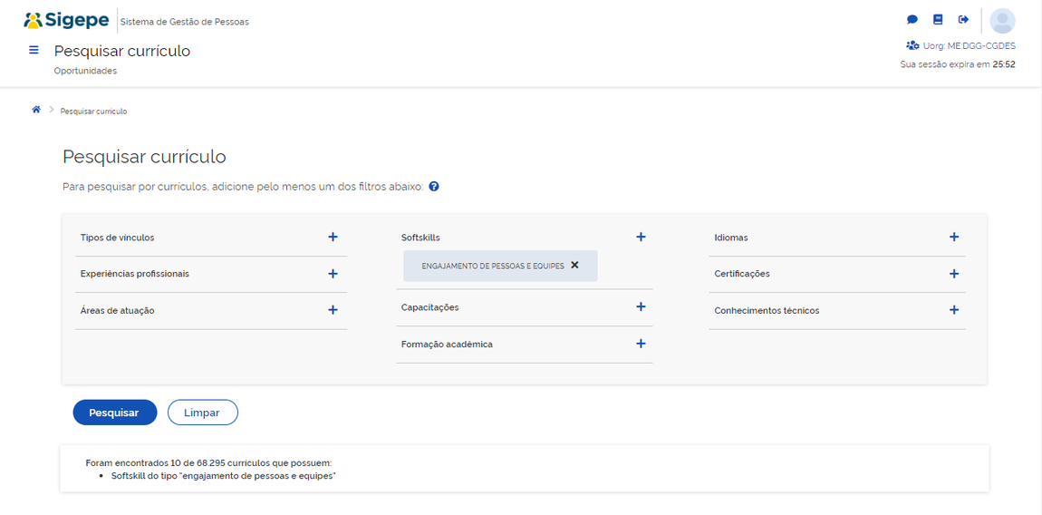 Ao clicar em "Pesquisar", o sistema retornará uma lista de currículos que contenham os parâmetros informados, ordenados pela aderência das informações dos currículos com os filtros selecionados.