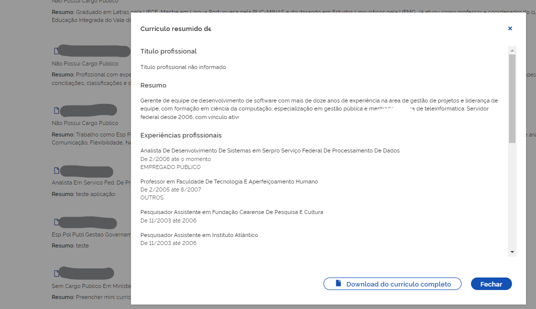 Clique no nome do usuário para visualizar o currículo resumido com as informações profissionais do usuário. Nesta tela também está disponível a opção de download do currículo completo: