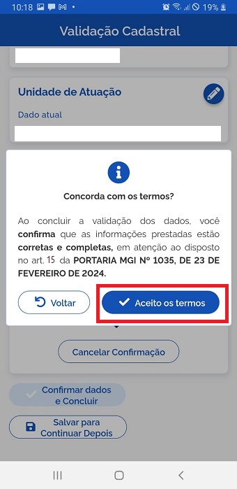Será aberto um Termo para Aceite. Para isso, clique em “Aceito os Termos”.