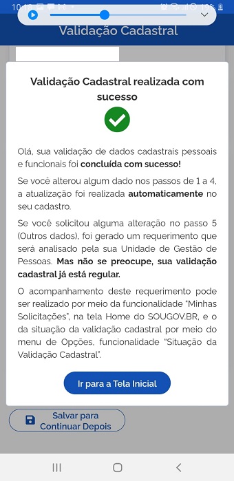 Caso você tenha clicado em “Salvar para Continuar Depois”, em qualquer etapa da Validação Cadastral ou mesmo ao acessar o SOUGOV.BR, e deseja continuar sua Validação Cadastral: