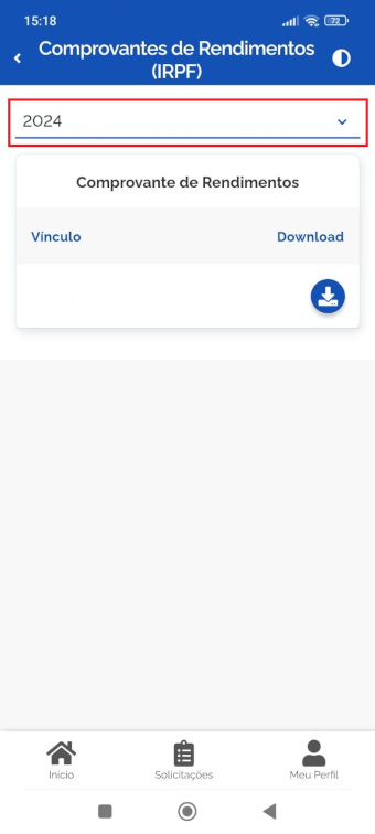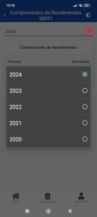 Caso deseje visualizar os Comprovantes de Rendimentos (IPRF) dos anos anteriores, clique no campo do "Ano" para escolher o ano desejado:
