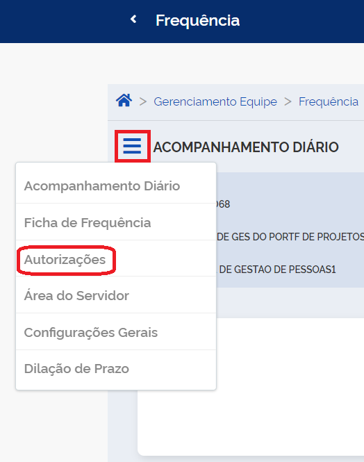 Selecione "Acompanhar Frequência", após, clique no menu localizado ao lado de "ACOMPANHAMENTO DIÁRIO" e em "Autorizações":