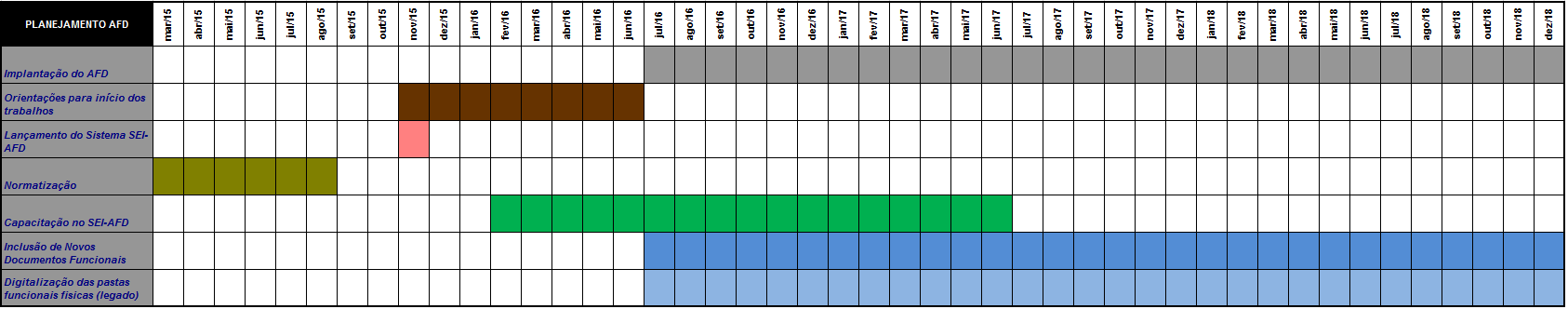 O início da operacionalização do AFD se deu no segundo semestre de 2015, na Etapa de inclusão de documentos funcionais na ferramenta SGAFD e a digitalização do legado ocorreu em 2016. Veja o cronograma de atividades.