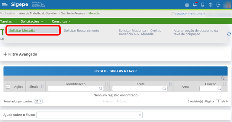 1. No menu Solicitações, clicar em Solicitar Moradia