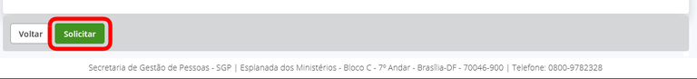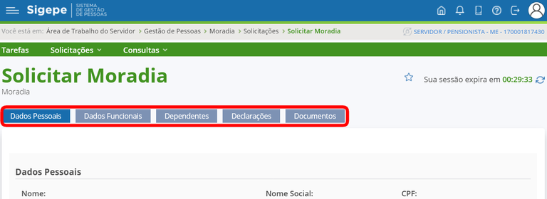Na página de solicitação, os Dados Pessoais são preenchidos automaticamente pelo cadastro registrado no Sigepe. Verifique se estão corretos e continue o processo. Caso seja necessário atualizar os dados, o servidor deve procurar a sua Unidade de Gestão de Pessoas.