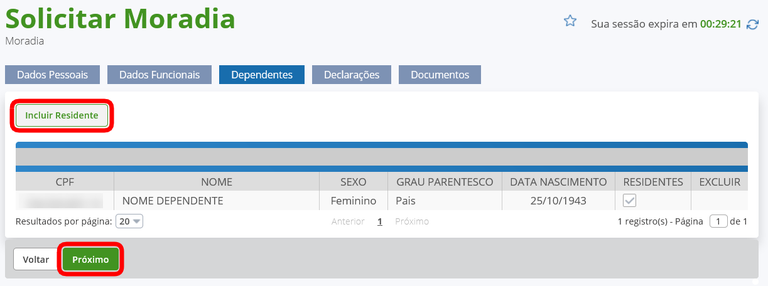 Em “Dependentes”, é possível incluir informações de pessoas que residem com o servidor.