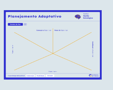 A imagem apresenta uma ferramenta visual de feedback e planejamento intitulada Estrela do Mar , que faz parte do Planejamento Adaptativo e tem uma duração sugerida de 30 minutos. Está inserida na temática de Gestão Estratégica.O conteúdo principal é um diagrama com eixos cruzados que dividem o espaço em cinco áreas de discussão, focadas no fazer e no ser, para o planejamento adaptativo:Fazer ou ser mais (Eixo vertical superior).Fazer ou ser menos (Eixo horizontal inferior).Começar a fazer ou ser (Acima do centro).Parar de fazer ou ser (Acima do centro).Continuar a fazer / ser (Lateral direita).O rodapé da imagem destaca as capacidades que emergem desta prática: Colaboração, Flexibilidade e Inovação. A imagem também inclui o logotipo da Academia de Líderes.