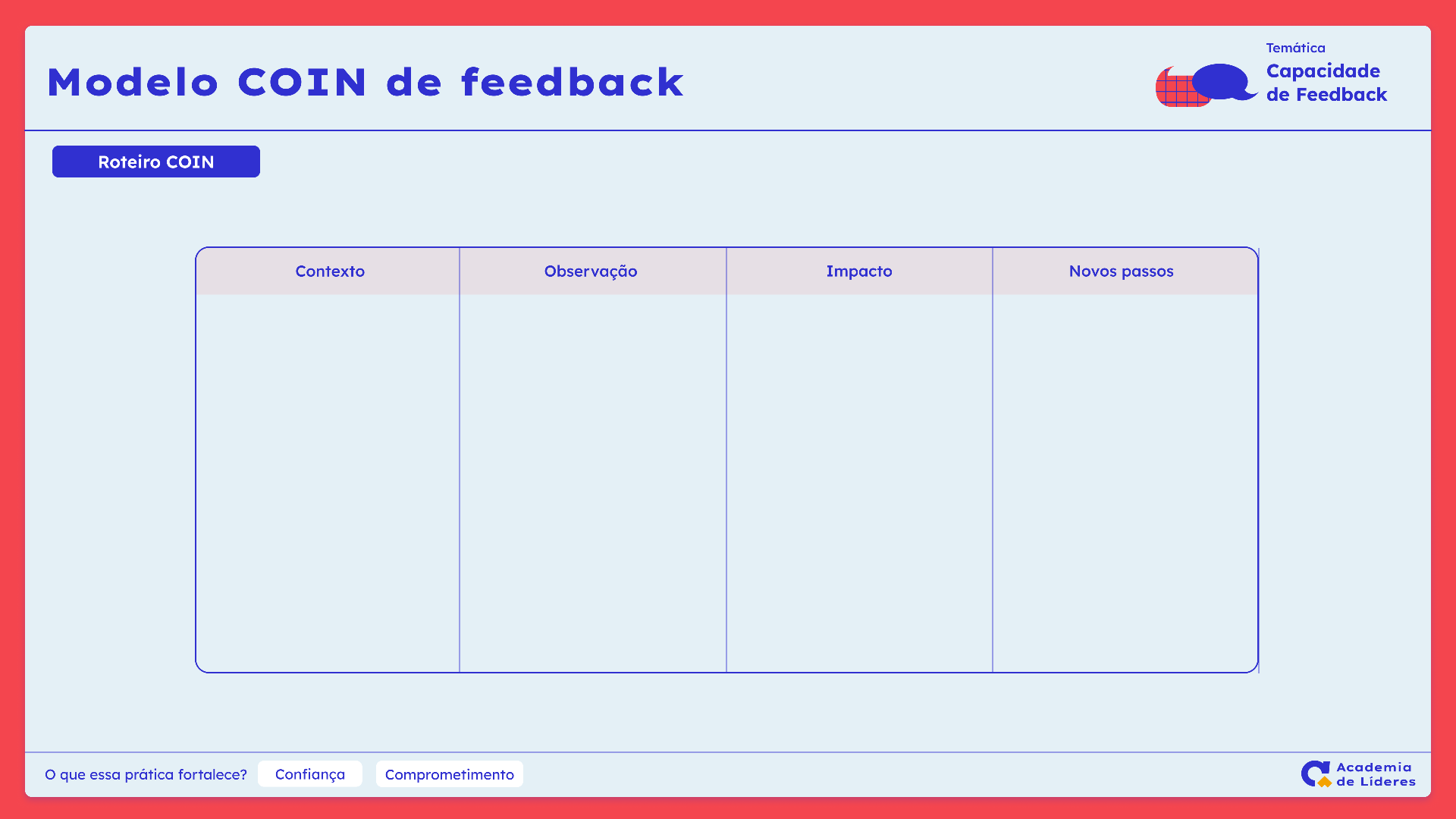 - Escreva o seu COIN. Organize o feedback em quatro partes: