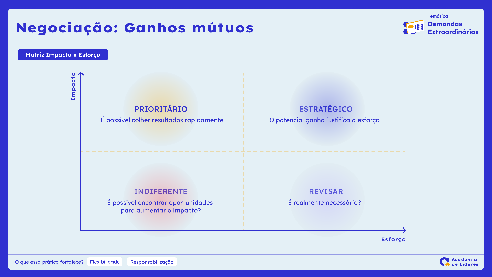 - Busca de critérios objetivos. Para garantir que o acordo seja justo, as decisões são baseadas em critérios objetivos, como impacto da decisão, nível de esforço, dados ou princípios reconhecidos por todos. Isso evita que o resultado dependa apenas do poder de barganha de cada lado. Nesta etapa é possível utilizar uma Matriz de Impacto x Esforço para compreender qual alternativa é mais interessante para a questão aprofundada.