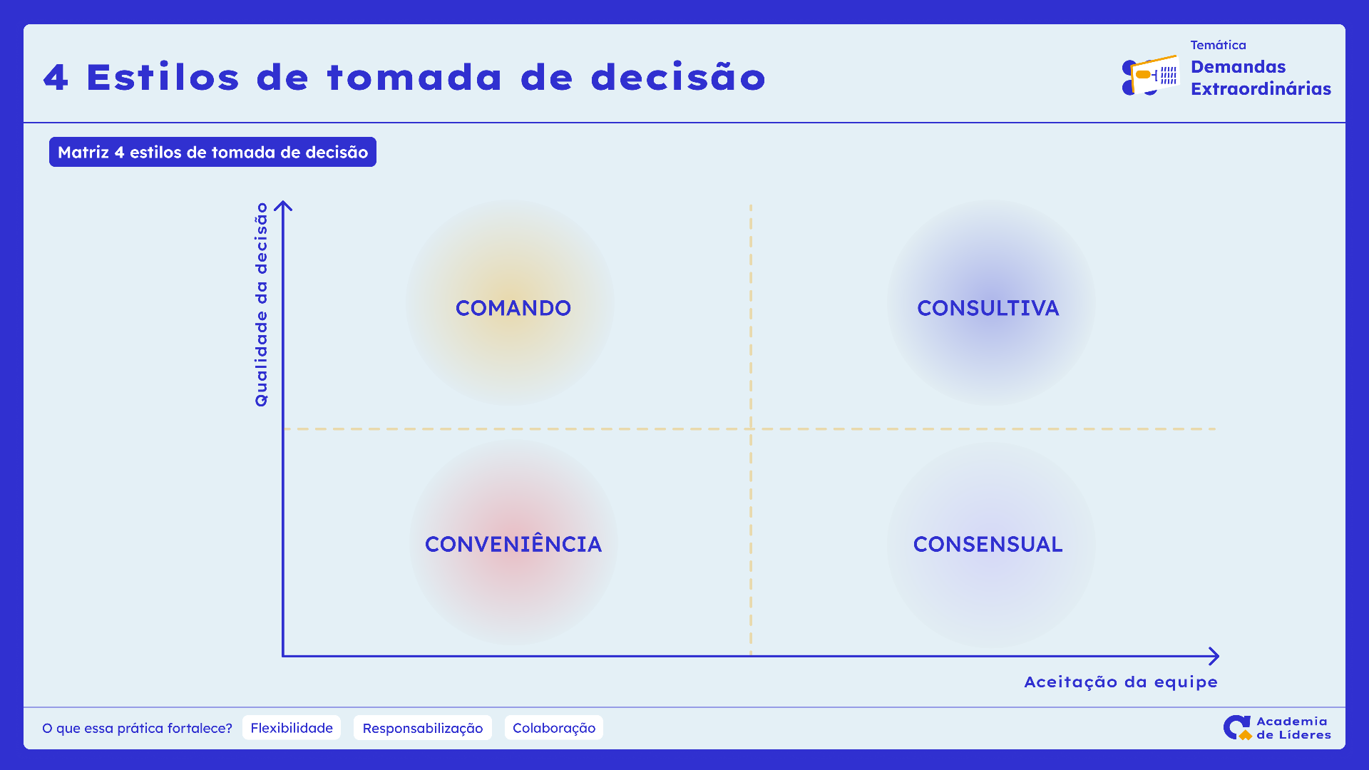 Ajudar as lideranças a entender qual é o melhor jeito de tomar uma decisão. O foco é definir quem deve ser envolvido no processo para garantir que todas as pessoas aceitem e apoiem a escolha final.