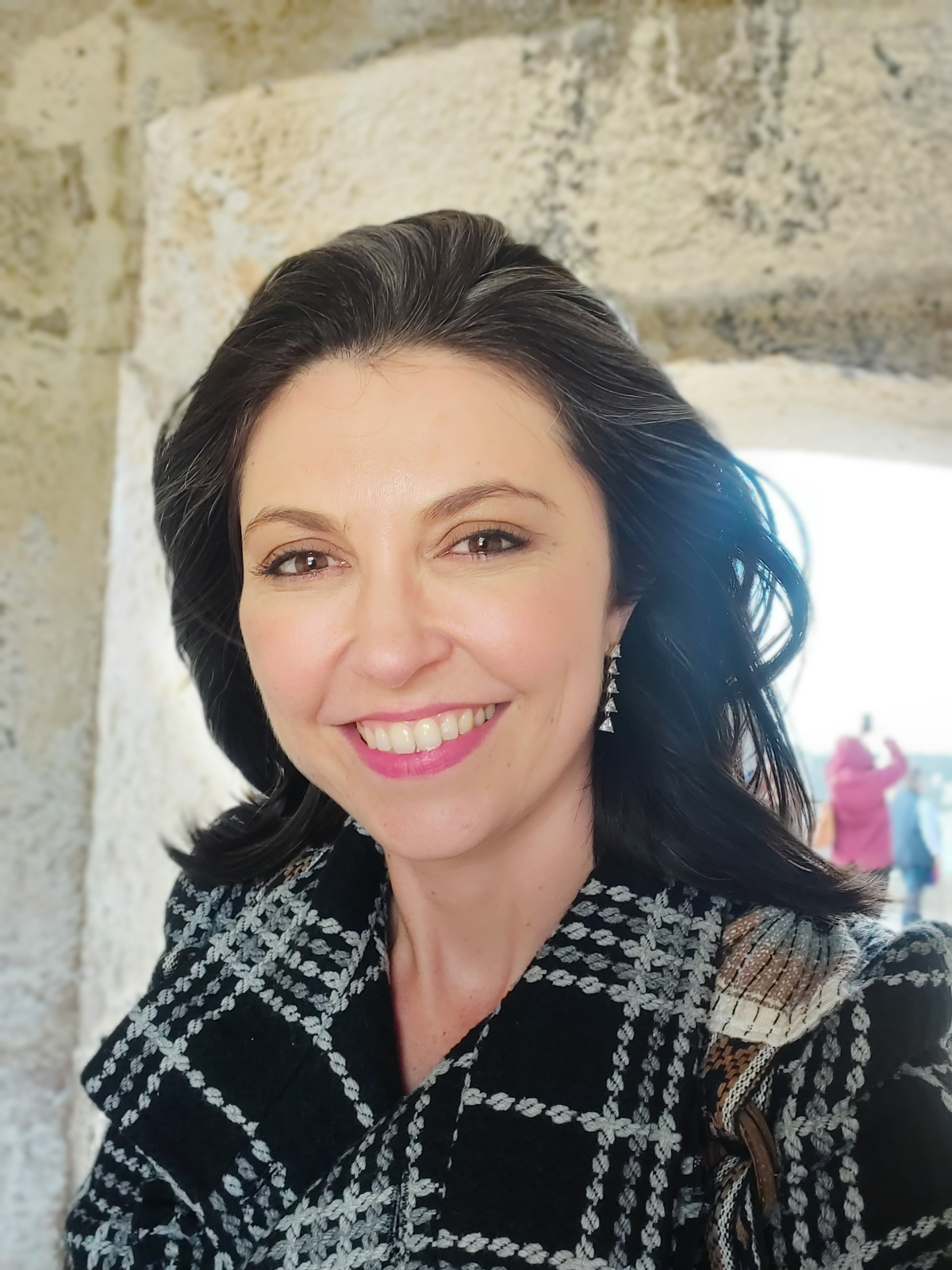 Mulher branca de olhos castanhos, cabelos pretos e lisos com mechas brancas. Veste um casaco xadrez, com paredes cinza ao fundo.