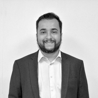 Foto em preto e branco. Homem com cabelos escuros, barba, veste uma camisa clara e um terno escuro e ao fundo há uma parede lisa.