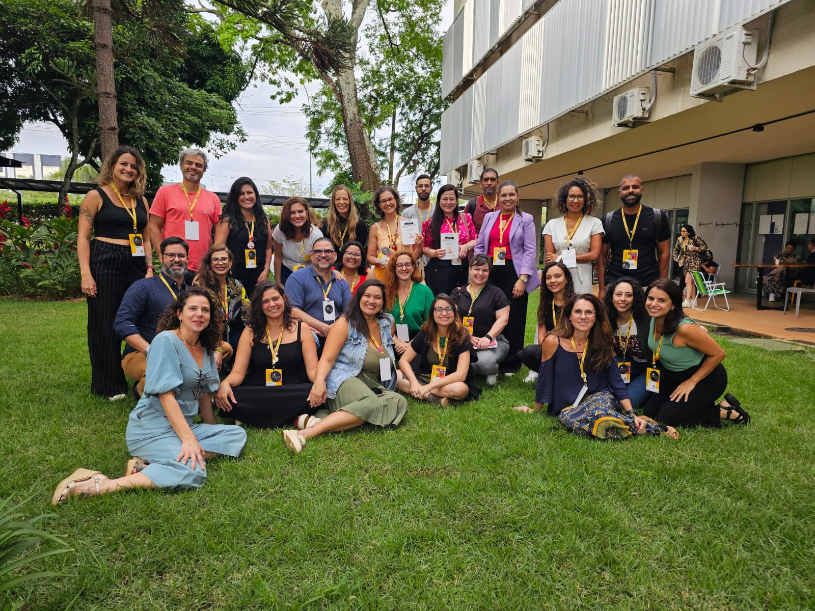 Cerca de 30 pessoas em pé e agachadas que fazem parte do Time do LA-BORA! gov e são Free-LAs do laboratório. Todas posando para a foto em um gramado, com árvores e uma parte do prédio da Enap no fundo.